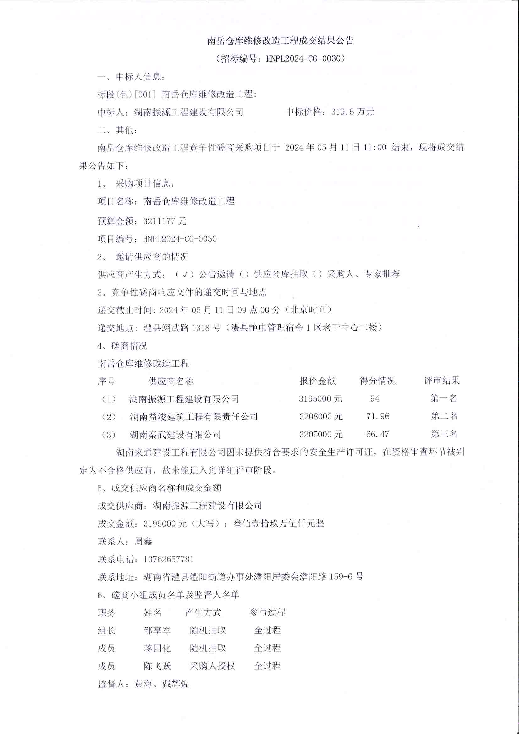 南岳仓库维修改造工程成交结果公告